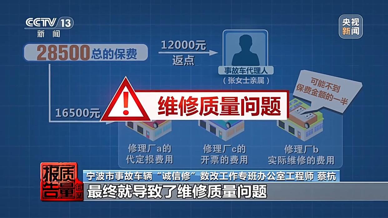 宁波市事故车辆“诚信修”数改工作专班办公室负责人 洪磊:实际上我们也有遇到过蛮多的案子,拿到理赔费用之后进行多方瓜分,真正用于事故车辆维修的可能已经不到一半了,甚至只有三成四成。可想而知这个车的质量肯定是有问题的。