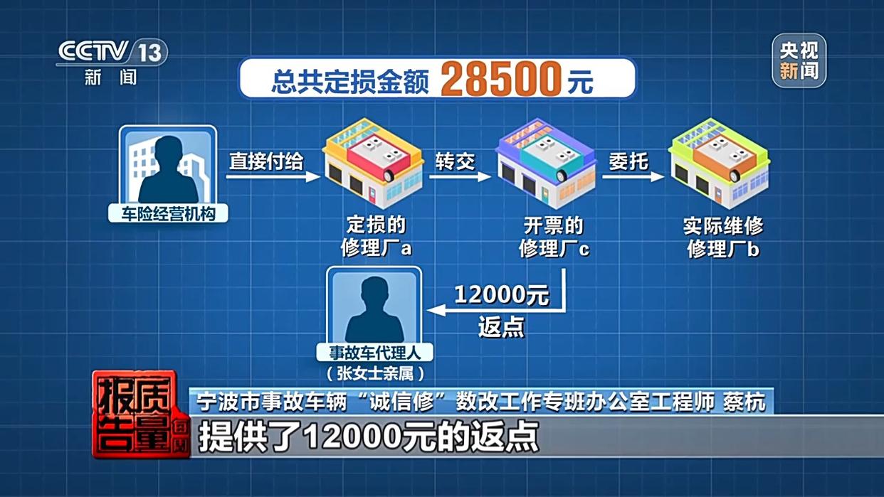 宁波市公安局镇海分局经侦大队民警 沃智达:他们定损价格都比较高。保险公司跟修理厂定损以后,比如说定个8万,修车只修2万,中间有6万有差价,然后修理厂比如说按照8万的定损价格,给他40%的返点,也就3万多会还给他,还有一些修车厂自己也要有钱赚。