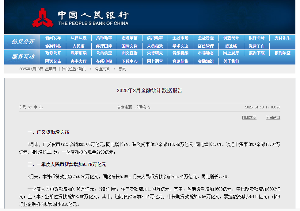数据显示,截至2025年3月末,社会融资规模同比增长8.4%,人民币贷款余额同比增长6.9%,增速较上月加快,广义货币供应量(M2)同比增长7%,增速基本稳定,金融继续保持对实体经济稳固的支持力度。