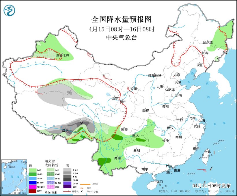 4月15日08时至16日08时,新疆沿天山地区和南疆盆地、西藏南部和东部、青海西部、川西高原北部等地部分地区有小雪或雨夹雪,其中,西藏东部和南部等地部分地区有中到大雪(5~9毫米)。新疆北部、西藏东南部、西南地区大部、湖南中西部及黑龙江东部等地部分地区有小到中雨。内蒙古西部、新疆南疆盆地等地部分地区有4~6级风,其中,新疆东部部分地区有6~7级风。
