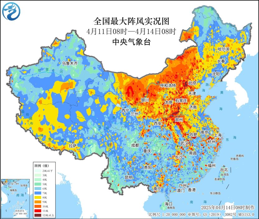 自4月11日以来,我国中东部大部地区出现大风天气,此次大风过程具有影响范围广、持续时间长、突破极值站点多等特点。阵风风力8级以上影响国土面积超过350万平方公里;内蒙古、华北、黄淮部分地区阵风11~13级,局地14~15级;大风最强时段出现在12日和13日。据气象监测显示,内蒙古、河北、河南、安徽、湖北等地共有327个国家级气象观测站最大阵风突破4月历史极值,其中陕西、山西、河北、河南等地64个国家级气象观测站突破历史极值。