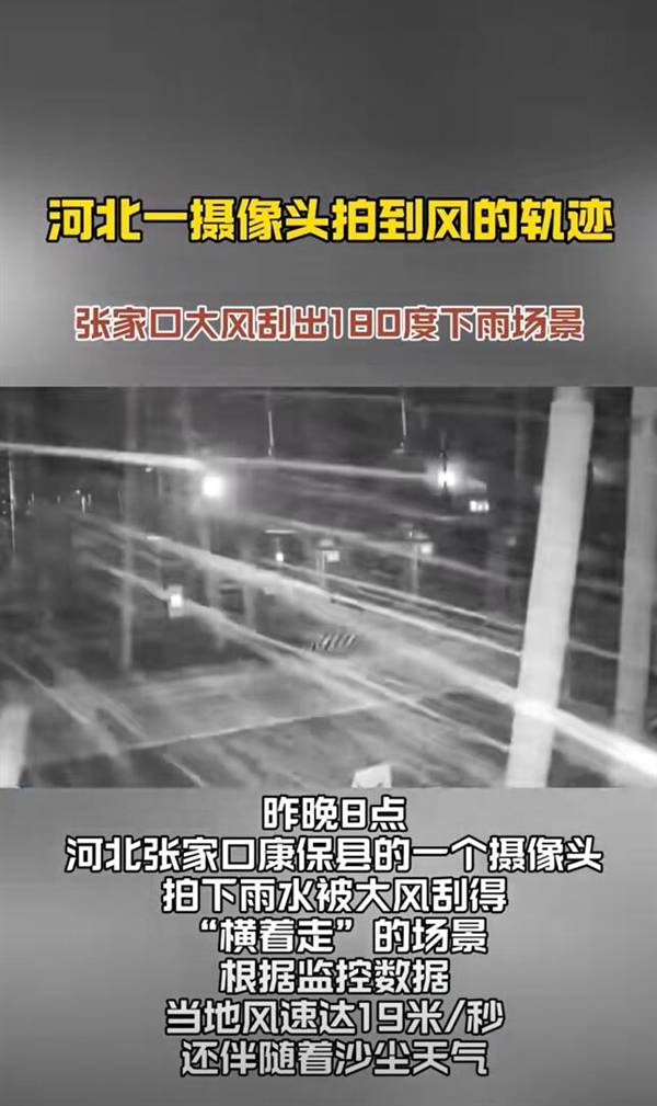 4月13日消息,据媒体报道,近日河北张家口康保县的一个摄像头拍下雨水被大风刮得“横着走”的场景。根据监控数据,当地风速达19米/秒,还伴随着沙尘天气。