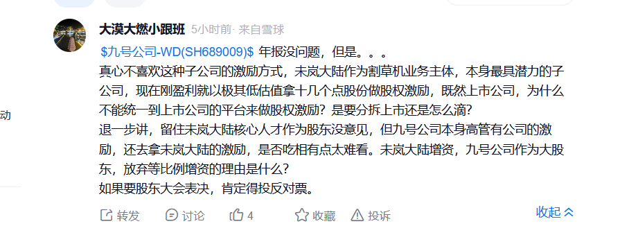 雪球网友“大漠大燃小跟班”表示:“真心不喜欢这种子公司的激励方式,未岚大陆作为割草机业务主体,本身最具潜力的子公司,现在刚盈利就以极其低估值拿十几个点股份做股权激励,既然上市公司,为什么不能统一到上市公司的平台来做股权激励?是要分拆上市还是怎么滴?退一步讲,留住未岚大陆核心人才作为股东没意见,但九号公司本身高管有公司的激励,还去拿未岚大陆的激励,是否吃相有点太难看。未岚大陆增资,九号公司作为大股东,放弃等比例增资的理由是什么?如果要股东大会表决,肯定得投反对票。”