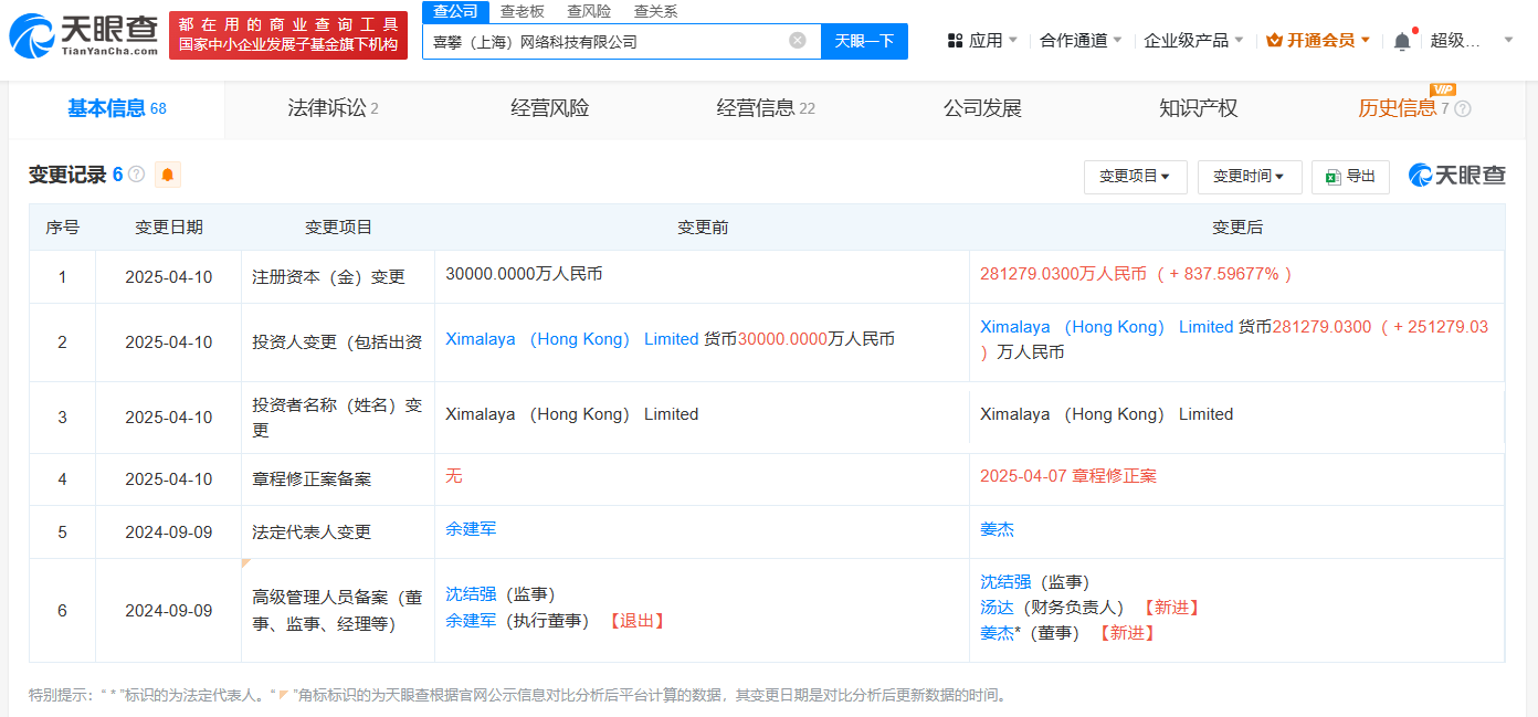 天眼查App显示,近日,喜攀(上海)网络科技有限公司发生工商变更,注册资本由3亿人民币增至约28亿人民币,增幅约837.6%。