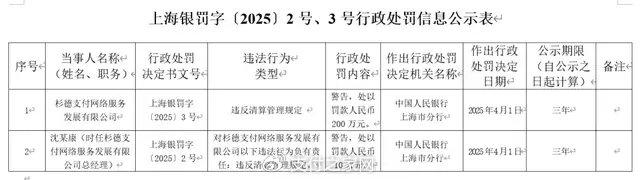 行政处罚决定书文号“上海银罚字〔2025〕3号”显示,杉德支付网络服务发展有限公司存在以下违法违规行为: