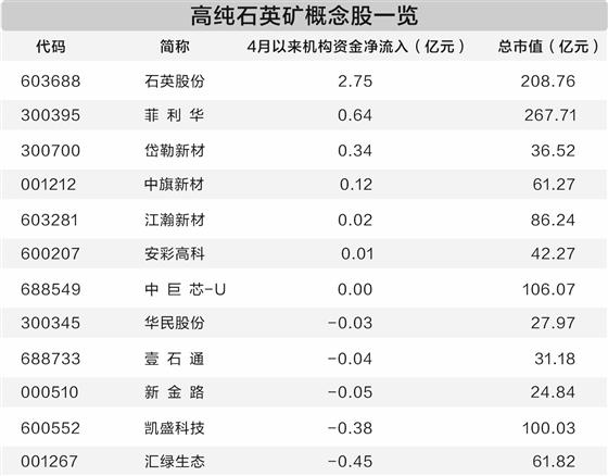 从资金面来看,6只高纯石英概念股本月以来获得机构资金净流入,石英股份净流入金额居首,达到2.75亿元;菲利华、岱勒新材、中旗新材紧随其后,分别为0.64亿元、0.34亿元、0.12亿元。
