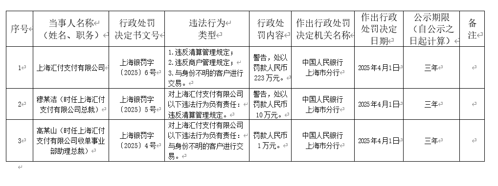 4月10日,据中国人民银行上海分行官网消息显示,汇付支付因违反反洗钱规定等3项违规被警告并罚款223万元。