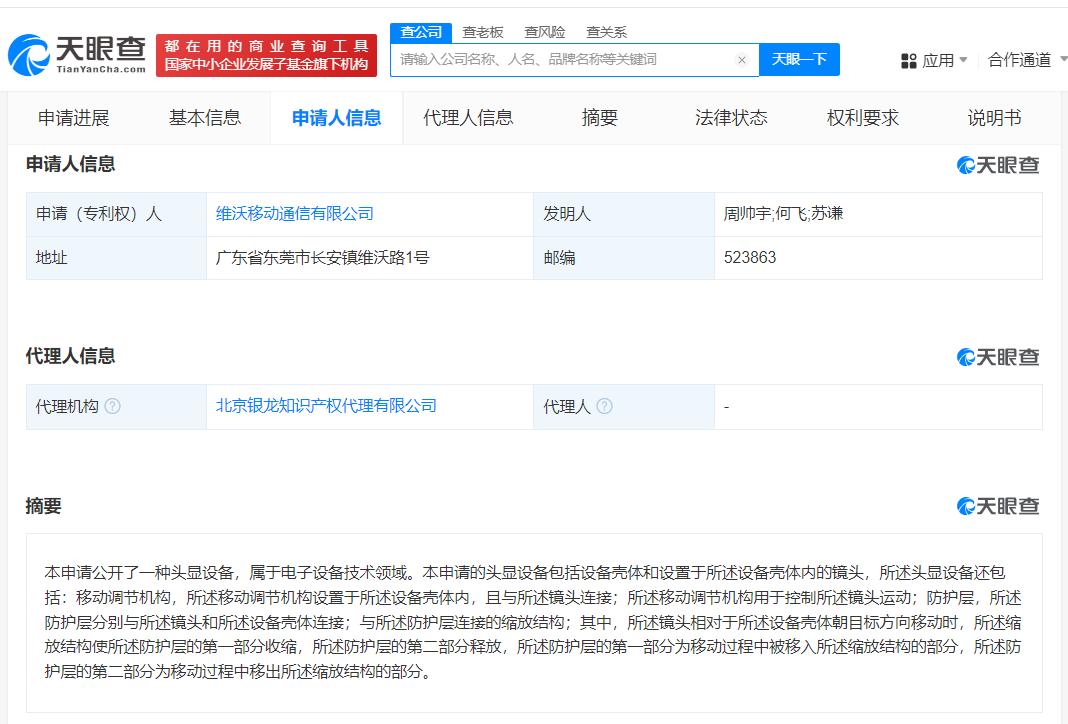 天眼查知识产权信息显示,近日,VIVO关联公司维沃移动通信有限公司申请的“头显设备”专利公布。