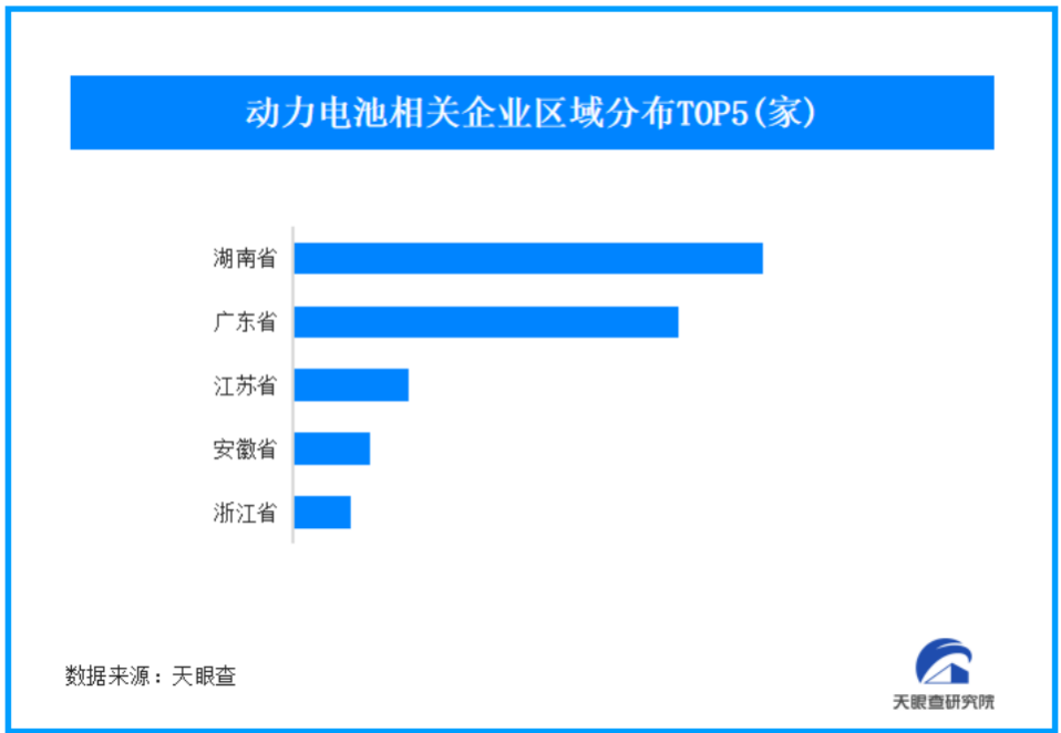 天眼查专业版数据显示,截至目前,我国现存动力电池相关的企业有6000余家。从地域分布上看,湖南省、广东省和江苏省动力电池相关企业数量位居前列,分别拥有2000余家、1700余家、500余家;从成立时间来看,近六成的相关企业成立于5-10年内,成立于1-5年内的相关企业占比24.10%。