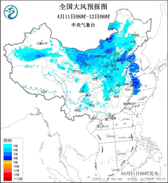 内蒙古、华北等地请警惕强风影响。预计11日至12日,中东部大部地区气温将先后下降6~10℃,其中,西北地区东部、内蒙古中东部、华北西部和北部、东北地区南部、江淮东部等地局地降温幅度可达12~16℃;上述地区和东部海域伴有5~7级风,阵风8~10级,局地可达11~13级。其中今天,长江以北地区风力较大,部分地区有5~7级大风,阵风8~10级,内蒙古中西部、河北北部等地局地阵风风力可达12~13级;渤海、渤海海峡、黄海大部海域、东海大部海域将有7~8级、阵风9~10级的大风,部分海域风力可达9级、阵风10级。