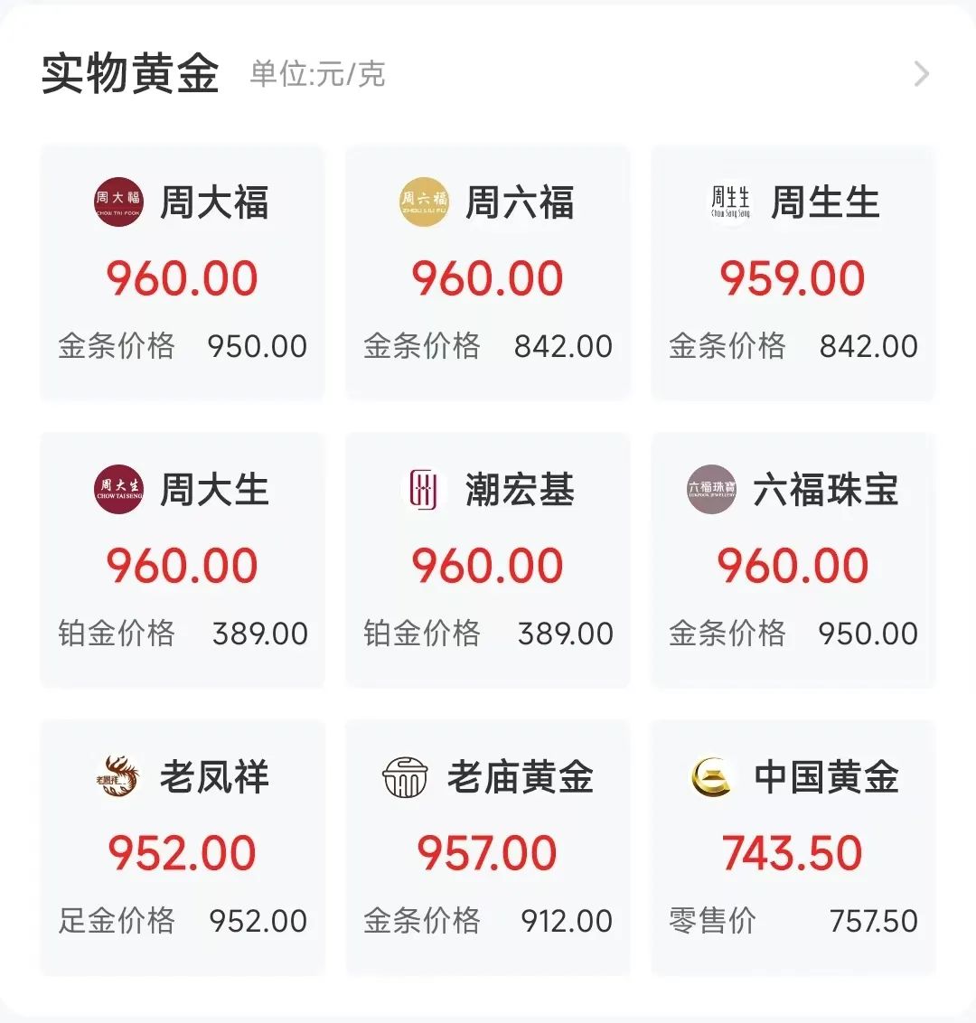 国内品牌金饰价格也随之上扬。据成都商报报道,4月3日以来金饰价格四连跌后又迎来三连涨。截至发稿,周生生金饰价格为959元/克,较4月7日低点上涨47元/克;老庙金饰价格为957元/克,较4月7日低点上涨39元/克;周大福金饰价格为960元/克,较4月7日低点上涨42元/克。