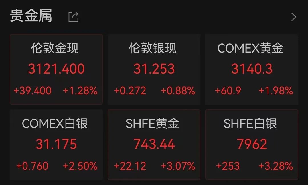 4月10日凌晨,国际贵金属期货大幅收涨,COMEX黄金期货涨3.67%报3099.8美元/盎司,创2020年3月以来最大盘中涨幅。