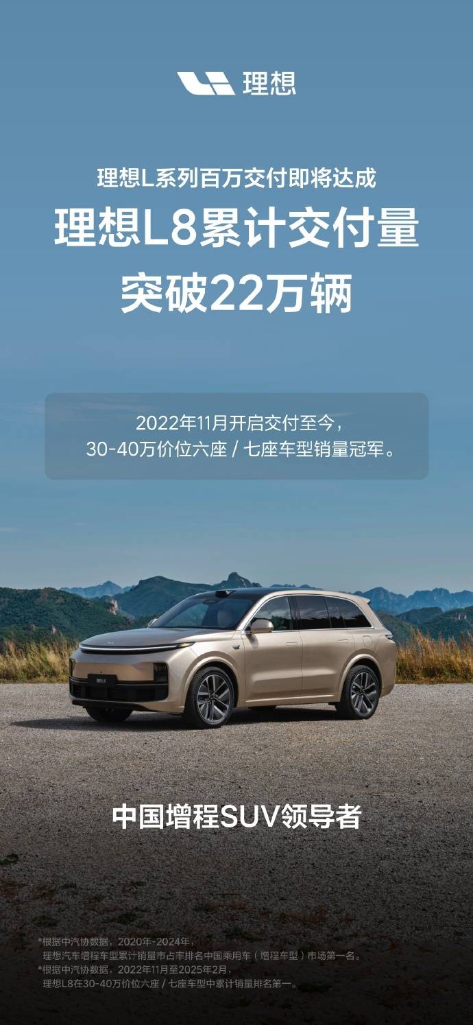 理想L8是理想汽车旗下智能豪华中大型SUV,2022年9月30日上市。4月2日,理想汽车宣布旗下L系列累计交付量突破100万辆大关,家庭六座豪华SUV理想L8累计交付量突破22万辆,是30-40万价位六座/七座车型销量冠军。