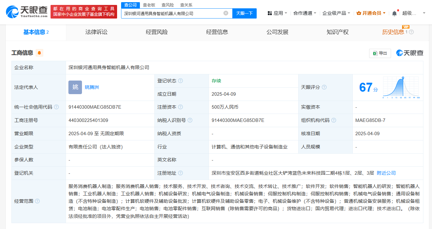 天眼查App显示,近日,深圳银河通用具身智能机器人有限公司成立,法定代表人为姚腾洲,注册资本500万人民币,经营范围包括服务消费机器人制造、服务消费机器人销售、工业机器人制造、货物进出口等。股东信息显示,该公司由北京银河通用机器人有限公司全资持股。