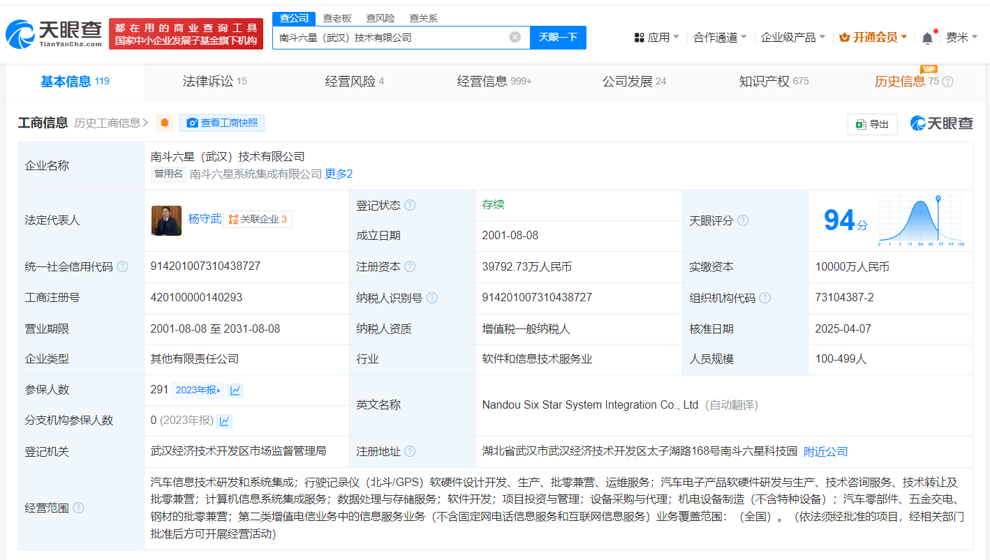 天眼查App显示,近日,南斗六星(武汉)技术有限公司发生工商变更,注册资本由500万人民币增至约3.98亿人民币,增幅约7859%。