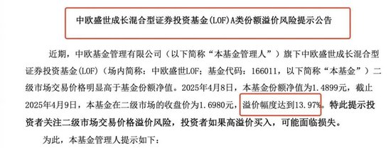 4月9日晚,中欧基金发布公告称,近期,旗下中欧盛世成长混合(LOF)二级市场交易价格明显高于基金净值。4月8日净值为1.4899元,截至4月9日,本基金在二级市场的收盘价为1.6980元,溢价幅度达到13.97%。特此提示投资者关注二级市场交易价格溢价风险,投资者如果高溢价买入,可能面临损失。