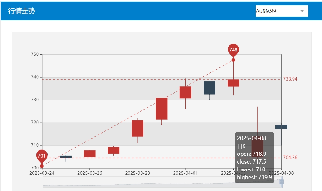 中国国内金条价格参考上海黄金交易所Au99.99报价。上海黄金交易所官网显示,Au99.99价格在清明节前一周整体处于上涨态势。近日开始下行。