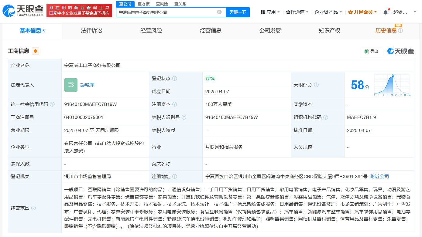 天眼查App显示,近日,宁夏喵电电子商务有限公司成立,法定代表人为彭艳萍,注册资本100万人民币,经营范围包括互联网销售、通信设备销售、二手日用百货销售、日用百货销售、新能源汽车整车销售等。股东信息显示,该公司由浙江天猫技术有限公司全资持股。