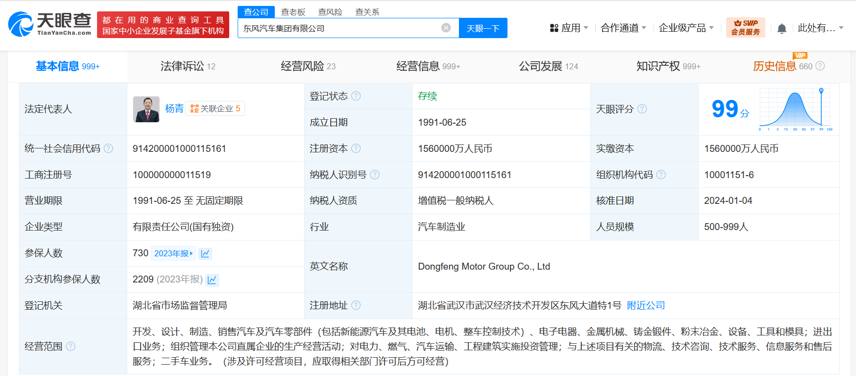 东风汽车集团有限公司成立于1991年6月,法定代表人为杨青,注册资本156亿人民币,经营范围含开发、设计、制造、销售汽车及汽车零部件,工程建筑实施投资管理,二手车业务等。