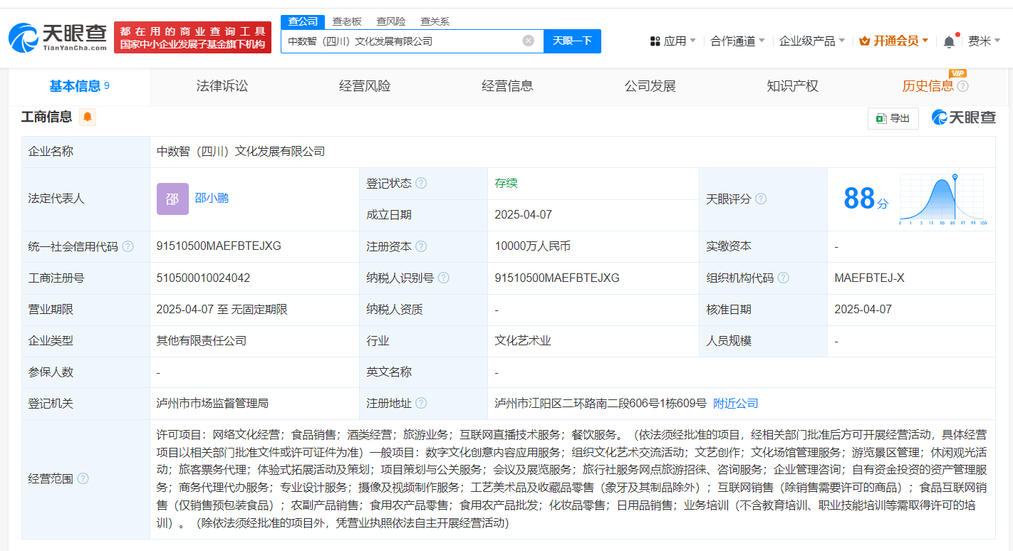 天眼查App显示,近日,中数智(四川)文化发展有限公司成立,法定代表人为邵小鹏,注册资本1亿人民币,经营范围包括网络文化经营、食品销售、酒类经营、旅游业务、互联网直播技术服务、餐饮服务等,由泸州老窖集团旗下泸州老窖创新产业控股有限公司、中国数字图书馆有限责任公司、泸州原界文化旅游开发有限公司共同持股。