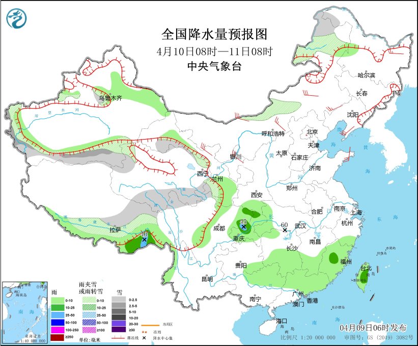 4月10日08时至11日08时,内蒙古东北部、新疆南疆盆地和南疆西部山区、西藏东部和南部、青海南部、甘肃河西、川西高原北部等地部分地区有小到中雪或雨夹雪。新疆北疆东部、西藏东南部、甘肃南部、四川盆地东部以及江汉西部、江南中南部、华南中北部、台湾岛等地部分地区有小到中雨,其中,西藏东南部、重庆中部等地部分地区有大雨(25~45毫米)。内蒙古中东部、甘肃河西、宁夏北部、黑龙江东北部、辽东半岛、山东半岛等地部分地区有4~6级风。