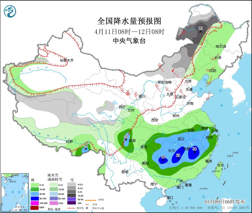 4月11日08时至12日08时,新疆南疆西部山区、内蒙古中东部、黑龙江西北部、西藏中北部、青海南部和西部、河北北部、川西高原北部等地部分地区有小到中雪或雨夹雪,其中,内蒙古东北部、黑龙江西北部等地部分地区有大雪,局地暴雪(10~18毫米)。西南地区东部、江汉、江淮西部、江南大部、华南北部等地部分地区有中到大雨,其中,湖南中西部和南部、江西大部、福建西北部、广西北部等地部分地区有暴雨(50~80毫米)。内蒙古中东部、黑龙江西南部、吉林中部、辽宁中南部、甘肃河西、山西北部、河北中部、山东半岛等地部分地区有5~6级风,阵风7~8级风。