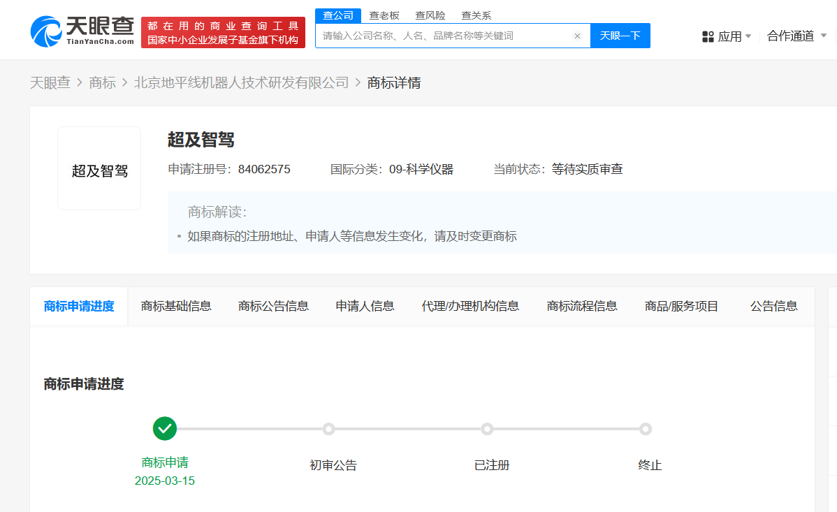 天眼查财产线索信息显示,近日,北京地平线机器人技术研发有限公司申请注册“地平线超及”“地平线超及智驾”“超及智驾”等商标,国际分类为科学仪器、网站服务,当前商标状态均为等待实质审查。