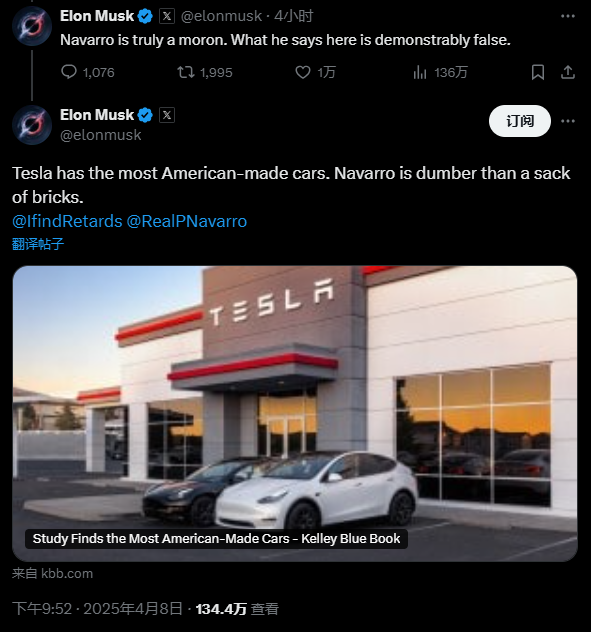 周二(4月8日)上午,马斯克转发了纳瓦罗的采访片段并评论道,“纳瓦罗真是个蠢货(moron),他说的话显然是错误的。”