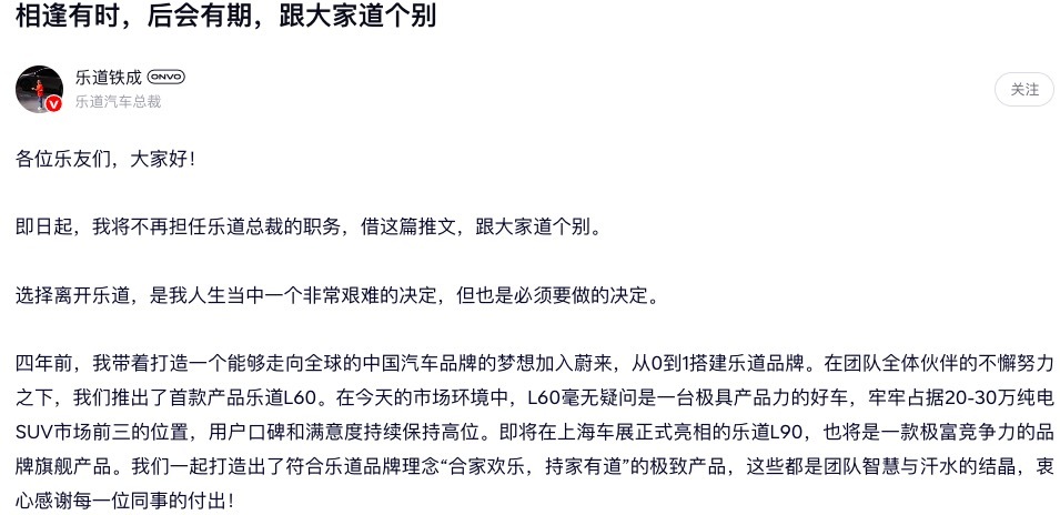 4月2日上午,乐道汽车总裁艾铁成通过乐道App发表文章宣布离职,不再担任乐道汽车总裁和蔚来高级副总裁。“在过去的一段时间,未让这台竞争力极强的好车(乐道L60)达到与它的产品力相匹配的销量。”艾铁成称。