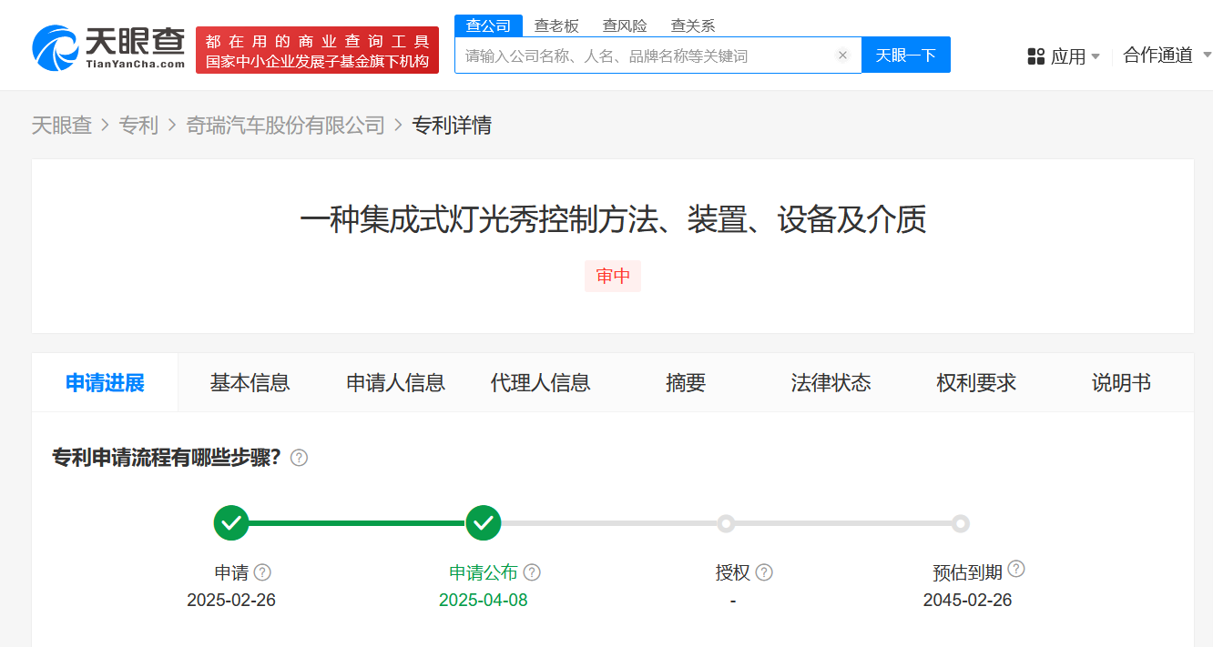 天眼查知识产权信息显示,近日,奇瑞汽车股份有限公司申请的“一种集成式灯光秀控制方法、装置、设备及介质”专利公布。