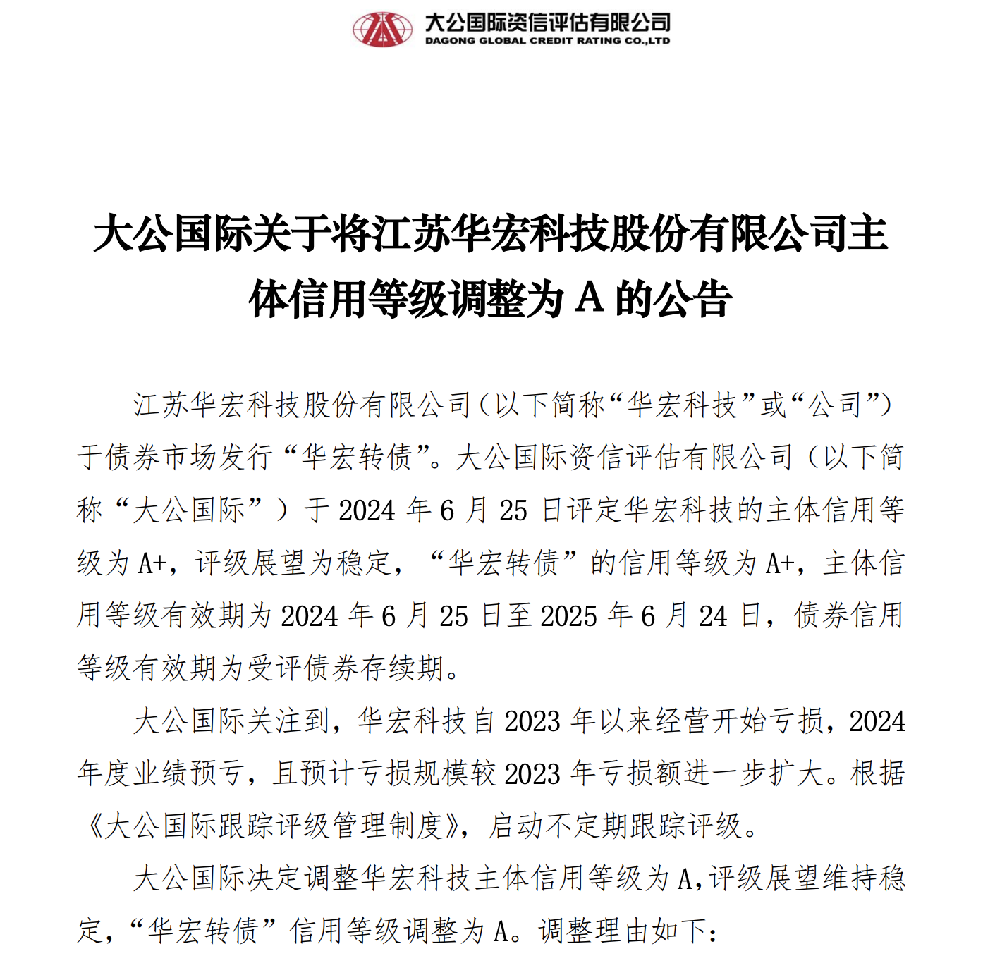 近日,大公国际发布公告,将江苏华宏科技股份有限公司(以下简称“华宏科技”或“公司”)(002645.SZ)主体信用等级由A+调整为A,评级展望维持稳定,“华宏转债”信用等级同步调整为A。