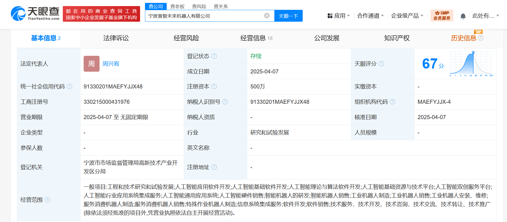 天眼查App显示,近日,宁波普智未来机器人有限公司成立,法定代表人为周兴宥,注册资本500万人民币,经营范围含工程和技术研究和试验发展、人工智能应用软件开发、人工智能基础软件开发、智能机器人的研发、智能机器人销售、工业机器人制造等。股东信息显示,该公司由宁波均普人工智能与人形机器人研究院有限公司以及智元机器人关联公司上海智元新创技术有限公司共同持股。
