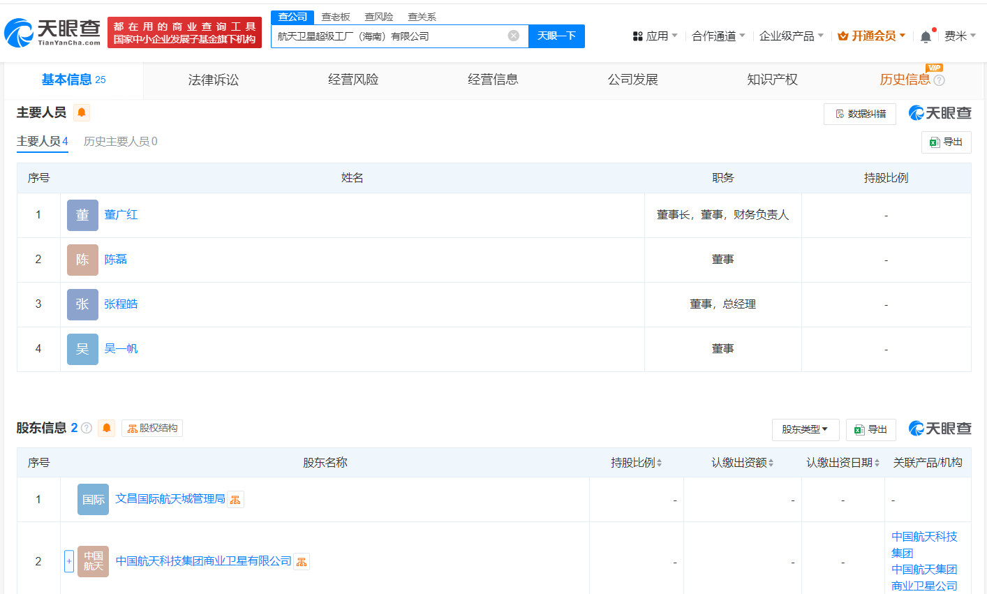 天眼查App显示,近日,航天卫星超级工厂(海南)有限公司成立,法定代表人为董广红,注册资本5亿人民币,经营范围包括微小卫星生产制造、微小卫星科研试验、检验检测服务、集成电路设计、电子专用设备销售、电子产品销售等,由文昌国际航天城管理局、中国航天科技集团商业卫星有限公司共同持股。
