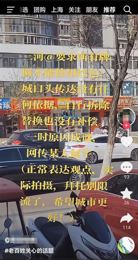 近日,有网友发布视频称,三河要求所有牌匾不能使用红色,城管口头传达,没有任何依据。商户需自行拆除,替换也没有补偿,一时原因成谜。