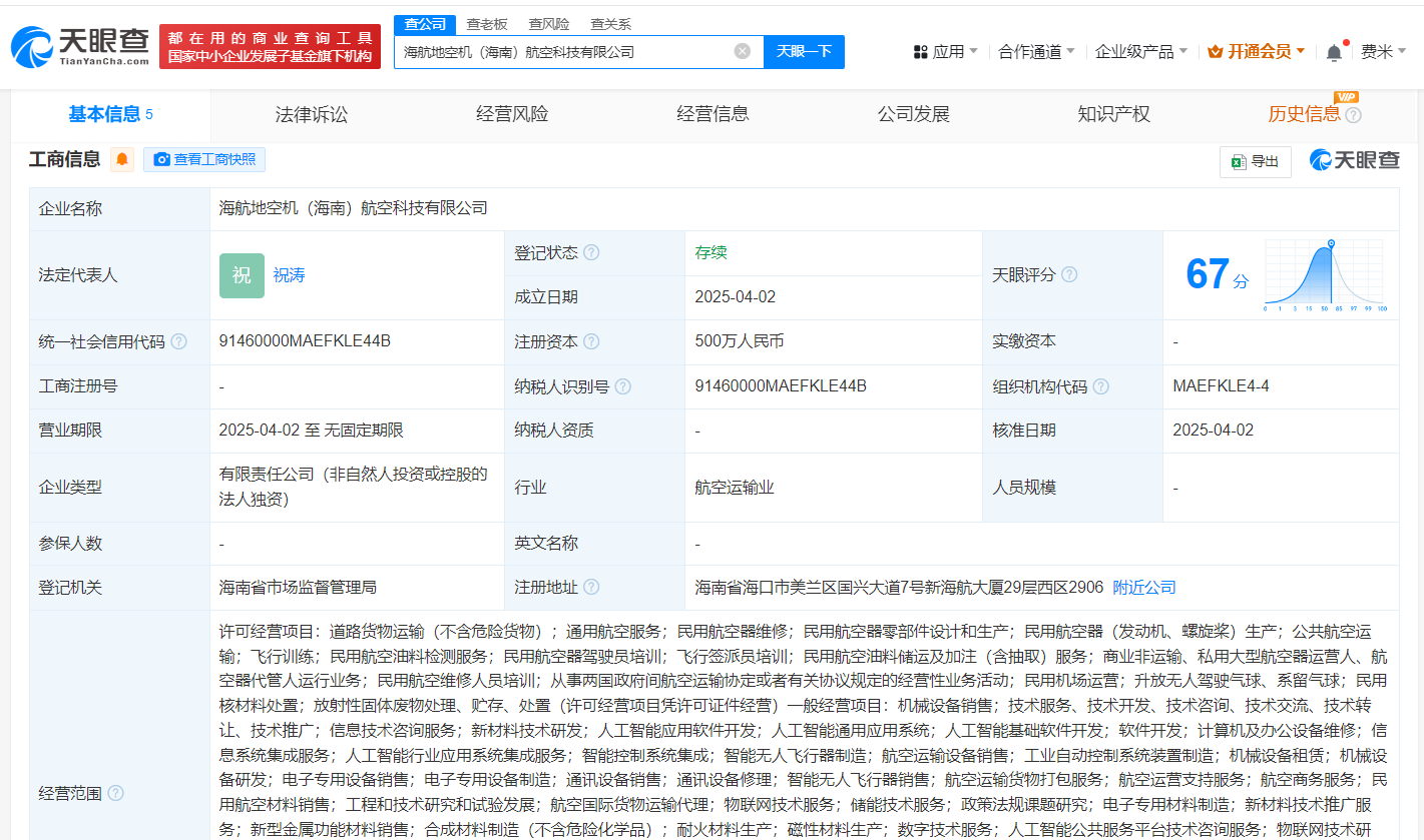 天眼查App显示,近日,海航地空机(海南)航空科技有限公司成立,法定代表人为祝涛,注册资本500万人民币,经营范围包括人工智能应用软件开发、人工智能通用应用系统、人工智能基础软件开发、智能控制系统集成、智能无人飞行器制造、航空运输设备销售等,由海航航空集团有限公司全资持股。