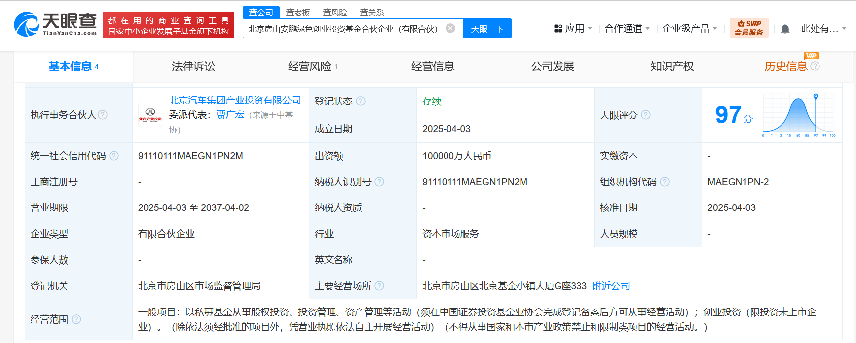 天眼查App显示,近日,北京房山安鹏绿色创业投资基金合伙企业(有限合伙)成立,执行事务合伙人为北京汽车集团产业投资有限公司,出资额10亿人民币,经营范围为以私募基金从事股权投资、投资管理、资产管理等活动,创业投资。合伙人信息显示,该基金由北汽集团旗下深圳市安鹏股权投资基金管理有限公司、北京汽车集团产业投资有限公司以及北京高端制造业基地投资开发有限公司共同出资。