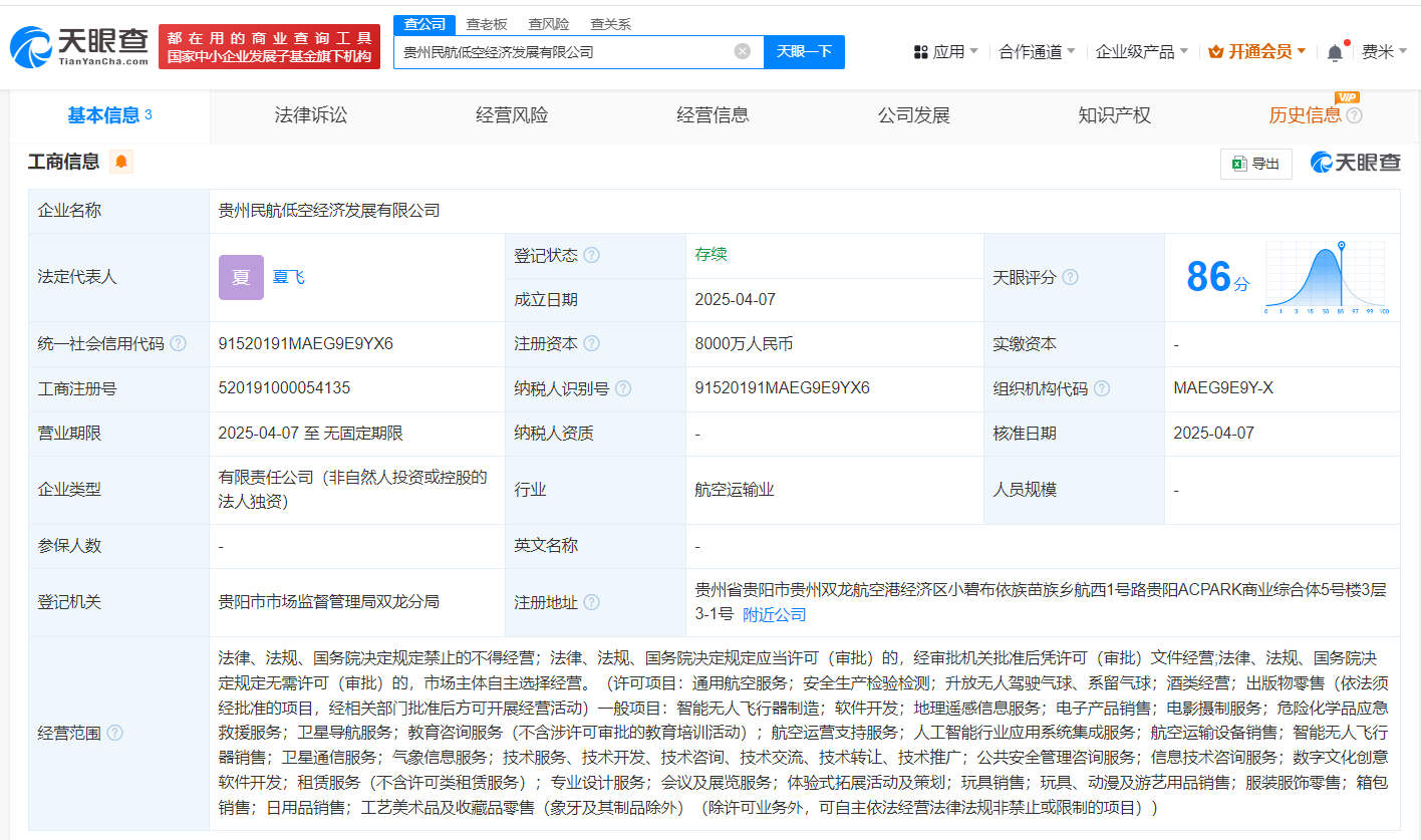 天眼查App显示,近日,贵州民航低空经济发展有限公司成立,法定代表人为夏飞,注册资本8000万人民币,经营范围包括通用航空服务、安全生产检验检测、智能无人飞行器制造、人工智能行业应用系统集成服务、航空运输设备销售、智能无人飞行器销售等,由贵州民航产业集团有限公司全资持股。