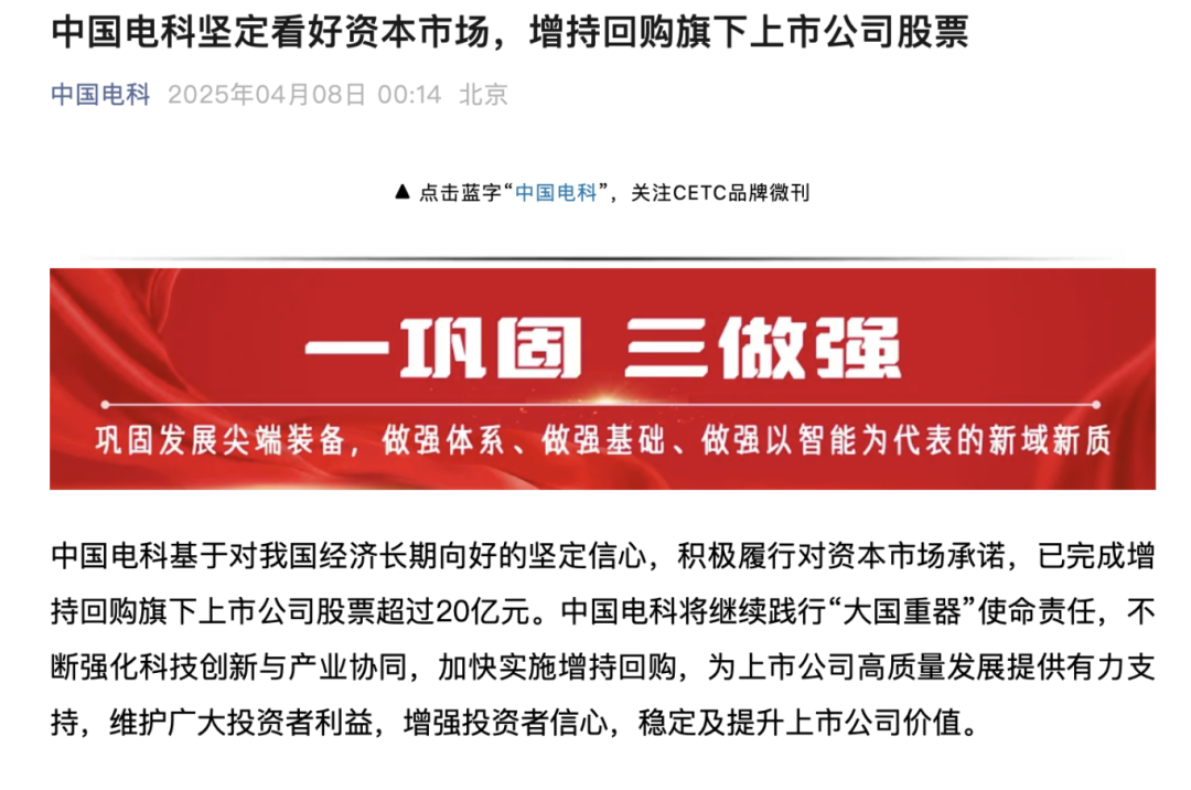 4月7日晚,中国电科发布公告称,基于对我国经济长期向好的坚定信心,积极履行对资本市场承诺,已完成增持回购旗下上市公司股票超过20亿元。