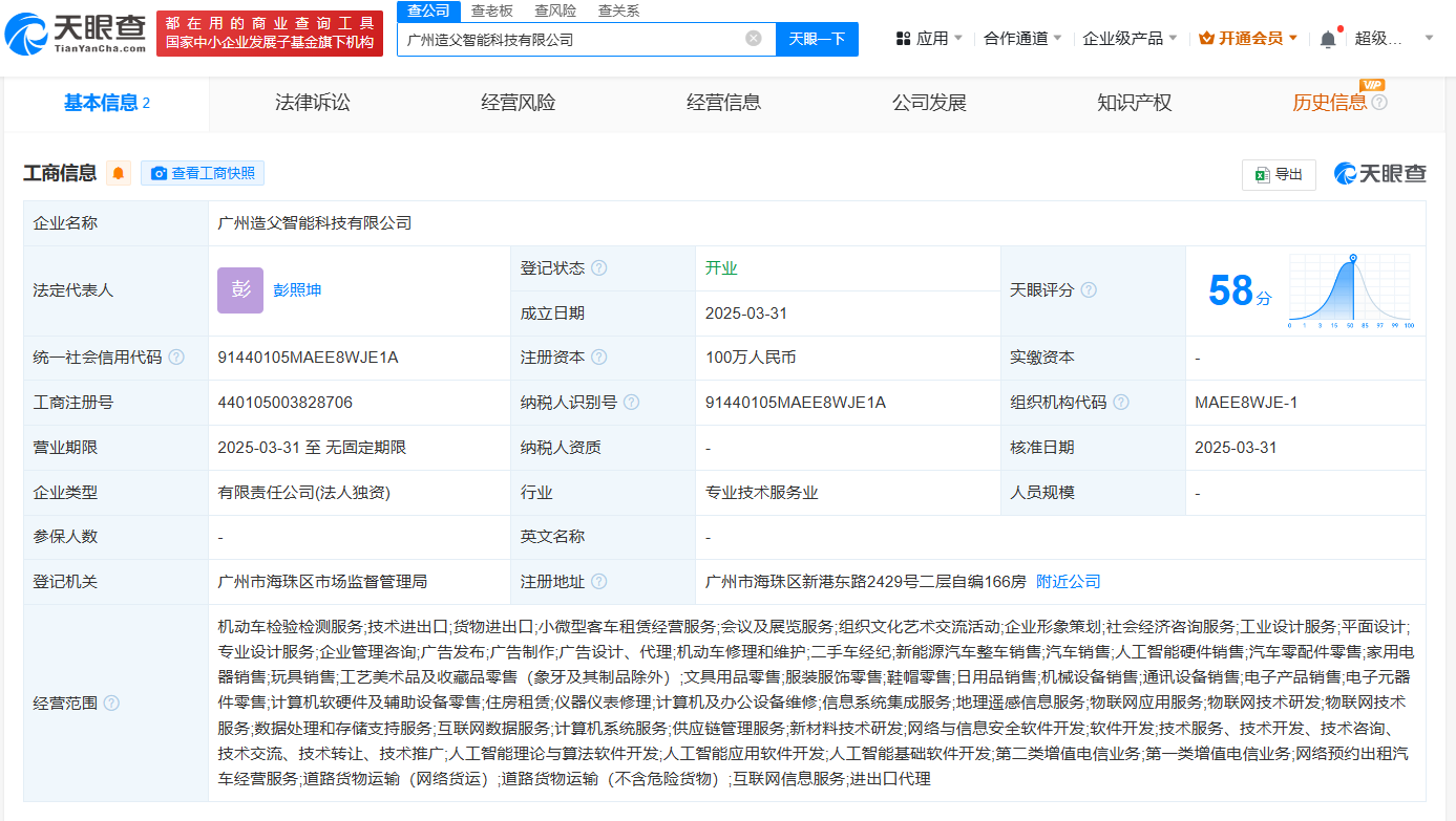 天眼查App显示,近日,广州造父智能科技有限公司成立,法定代表人为彭照坤,注册资本100万人民币,经营范围包括小微型客车租赁经营服务、二手车经纪、新能源汽车整车销售、人工智能硬件销售、人工智能应用软件开发等。股东信息显示,该公司由哈啰出行旗下上海钧丰网络科技有限公司全资持股。