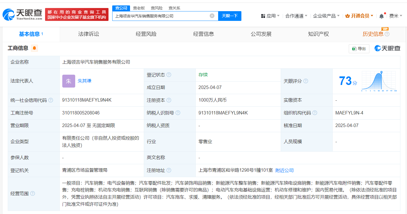 天眼查App显示,近日,上海领吉华汽车销售服务有限公司成立,法定代表人为朱其谦,注册资本1000万人民币,经营范围包括电气设备销售、汽车零配件批发、新能源汽车整车销售、新能源汽车换电设施销售、电动汽车充电基础设施运营、机动车修理和维护等,由领克汽车销售有限公司全资持股。