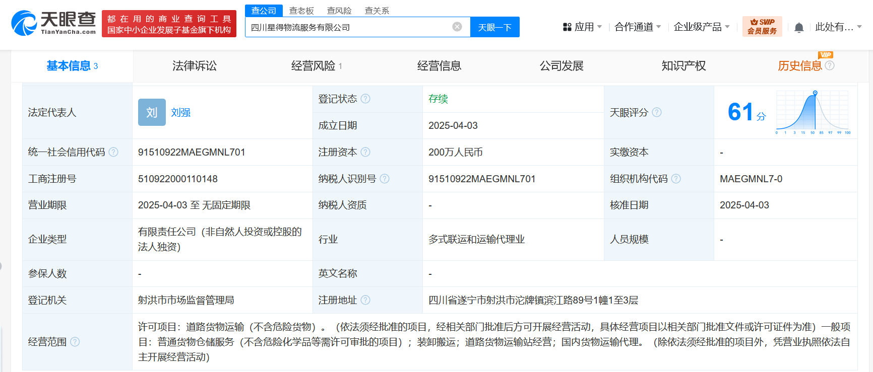 天眼查App显示,近日,四川星得物流服务有限公司成立,法定代表人为刘强,注册资本200万人民币,经营范围为道路货物运输、普通货物仓储服务、装卸搬运、道路货物运输站经营、国内货物运输代理。股东信息显示,该公司由舍得酒业(600702)全资持股。