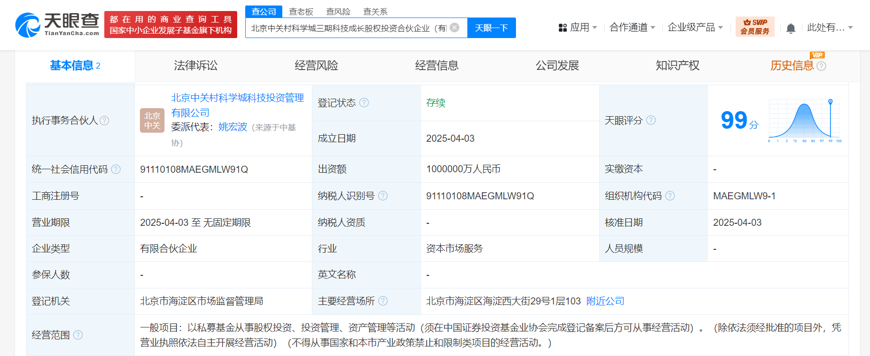 天眼查App显示,近日,北京中关村科学城三期科技成长股权投资合伙企业(有限合伙)成立,执行事务合伙人为北京中关村科学城科技投资管理有限公司,出资额100亿人民币,经营范围为以私募基金从事股权投资、投资管理、资产管理等活动。合伙人信息显示,该基金由北京市海淀区国有资产投资集团有限公司、北京中关村科学城科技投资管理有限公司共同出资。
