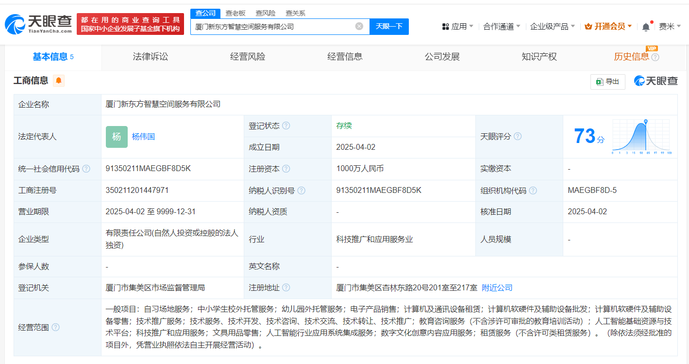 天眼查App显示,近日,厦门新东方智慧空间服务有限公司成立,法定代表人为杨伟国,注册资本1000万人民币,经营范围包括自习场地服务、中小学生校外托管服务、幼儿园外托管服务、电子产品销售、计算机及通讯设备租赁、计算机软硬件及辅助设备批发等,由新东方旗下新东方艺术培训(厦门)有限公司全资持股。