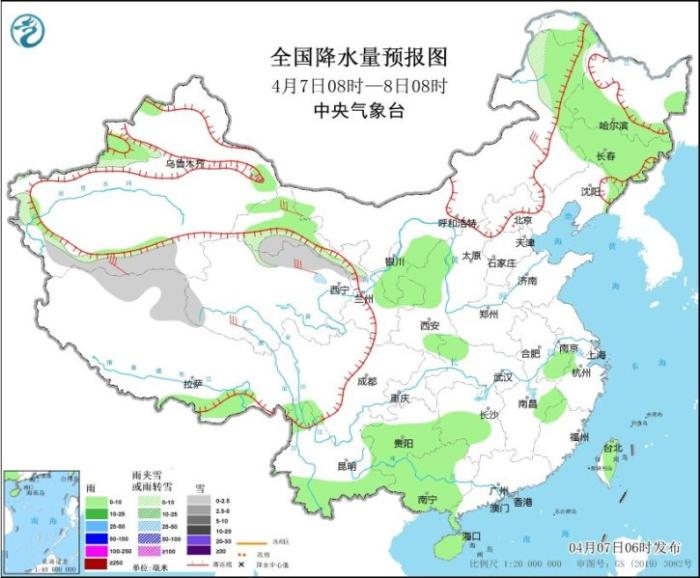 预计今明两天,全国大部地区降水仍较弱,西南地区东部、江南、华南西部和北部、台湾岛等地部分地区有小到中雨,局地有大雨;今天(7日)新疆南疆西部、青海北部、内蒙古东北部等地部分地区有小到中雪或雨夹雪。另外,8日夜间至9日,贵州东部、江南、华南北部等地部分地区有中到大雨,局地有暴雨,并伴有强对流天气。