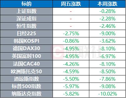 美东时间周五,美股三大指数大幅收跌,标普500指数跌5.97%,创2020年3月以来最大单日跌幅;本周收跌9.08%,创2020年3月以来最大单周跌幅。纳指跌5.82%,较历史最高收盘纪录下跌超过20%,确认进入技术性熊市区间。道指跌5.50%,收盘较历史最高收盘纪录低逾10%,确认进入修正区间。