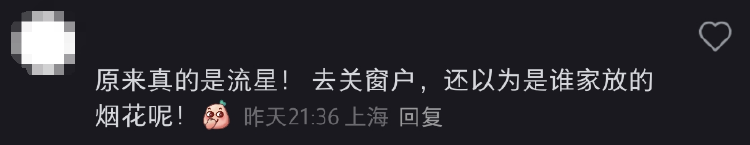 大量上海网友在社交媒体平台表示,看到“好大一个闪闪发光的绿色的流星”,时间大约在19时56分前后。从发布的画面和信息来看,徐汇、闵行、松江、浦东、崇明等各区都有网友目击,醒目的蓝绿色流星在空中拖出一道长长的尾巴。