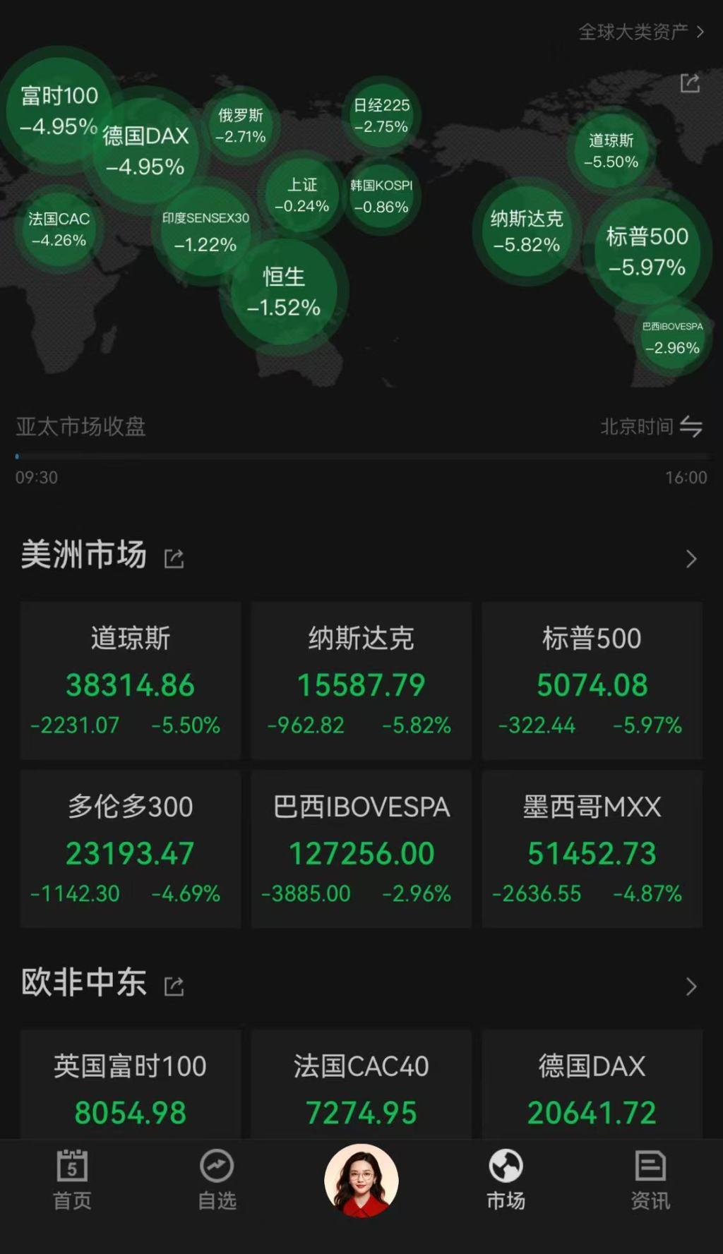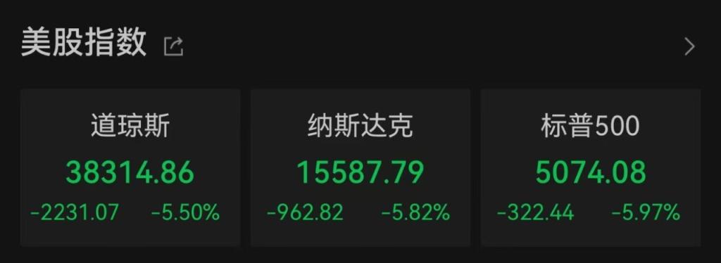 截至收盘,道指跌5.5%,报38314.86点,狂泻逾2200点;标普500指数跌5.97%,报5074.08点,创2020年3月以来最大单日跌幅;纳指跌5.82%,报15587.79点,进入技术性熊市区间。