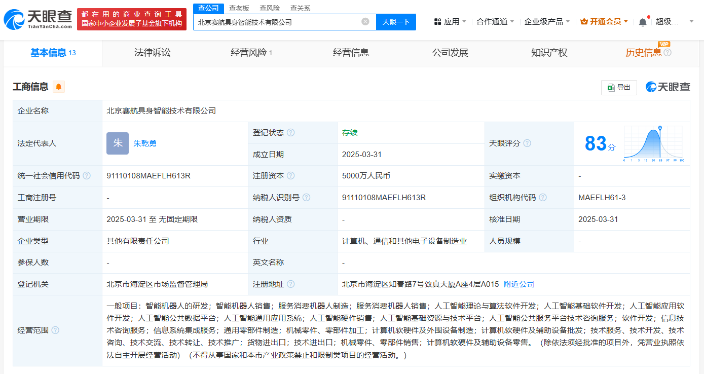 天眼查App显示,近日,北京赛航具身智能技术有限公司成立,法定代表人为朱乾勇,注册资本5000万人民币,经营范围包括智能机器人的研发、智能机器人销售、服务消费机器人制造、服务消费机器人销售等。股权全景穿透图显示,该公司由赛力斯(601127)旗下重庆凤凰技术有限公司、北京航空航天大学分别持股70%、30%。