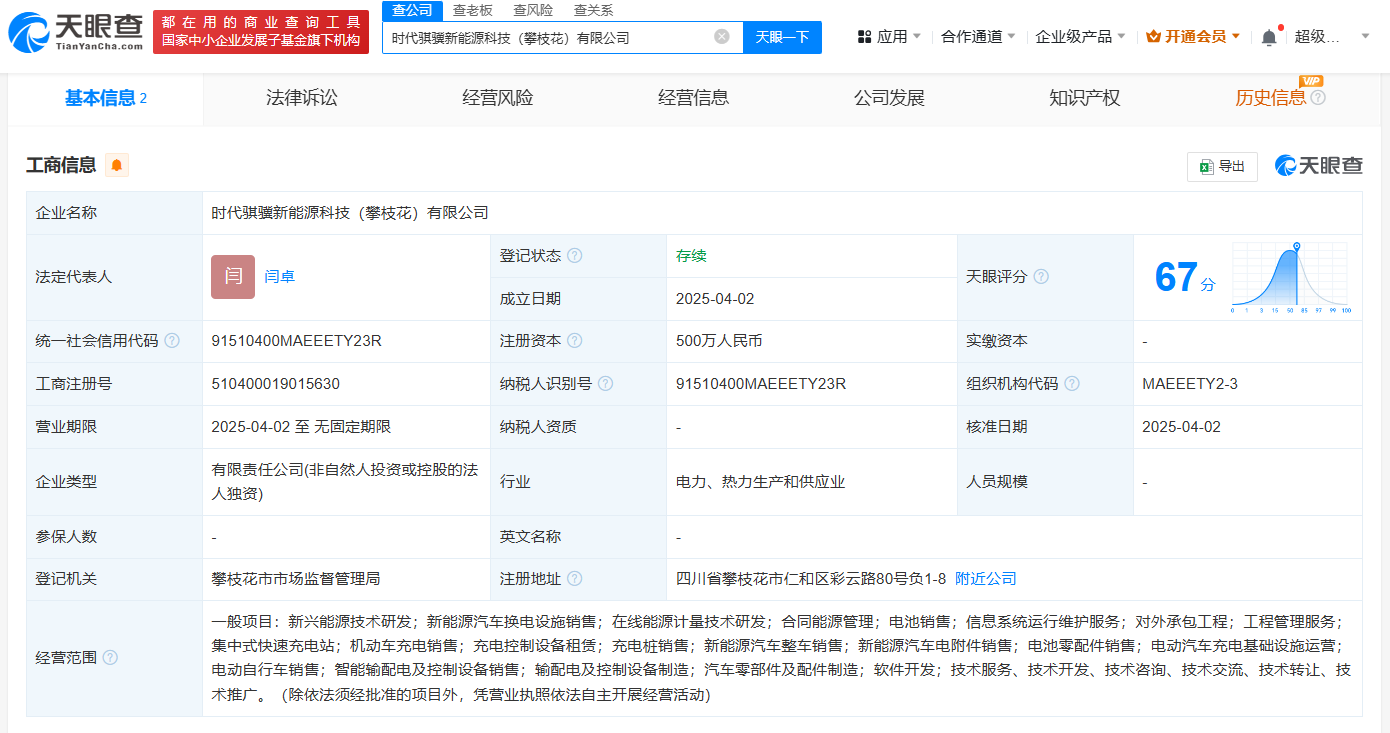 天眼查App显示,近日,时代骐骥新能源科技(攀枝花)有限公司成立,法定代表人为闫卓,注册资本500万人民币,经营范围包括新兴能源技术研发、新能源汽车换电设施销售、在线能源计量技术研发、合同能源管理、电池销售等。股东信息显示,该公司由宁德时代旗下时代骐骥绿能科技(成都)有限公司全资持股。