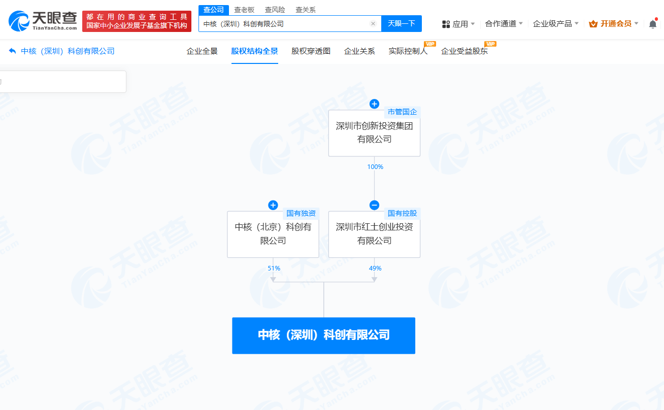 天眼查App显示,近日,中核(深圳)科创有限公司成立,法定代表人为赵欣,注册资本1000万人民币,经营范围包括以自有资金从事投资活动、自有资金投资的资产管理服务、新兴能源技术研发、储能技术服务等。股权全景穿透图显示,该公司由中核(北京)科创有限公司、深创投旗下深圳市红土创业投资有限公司共同持股。